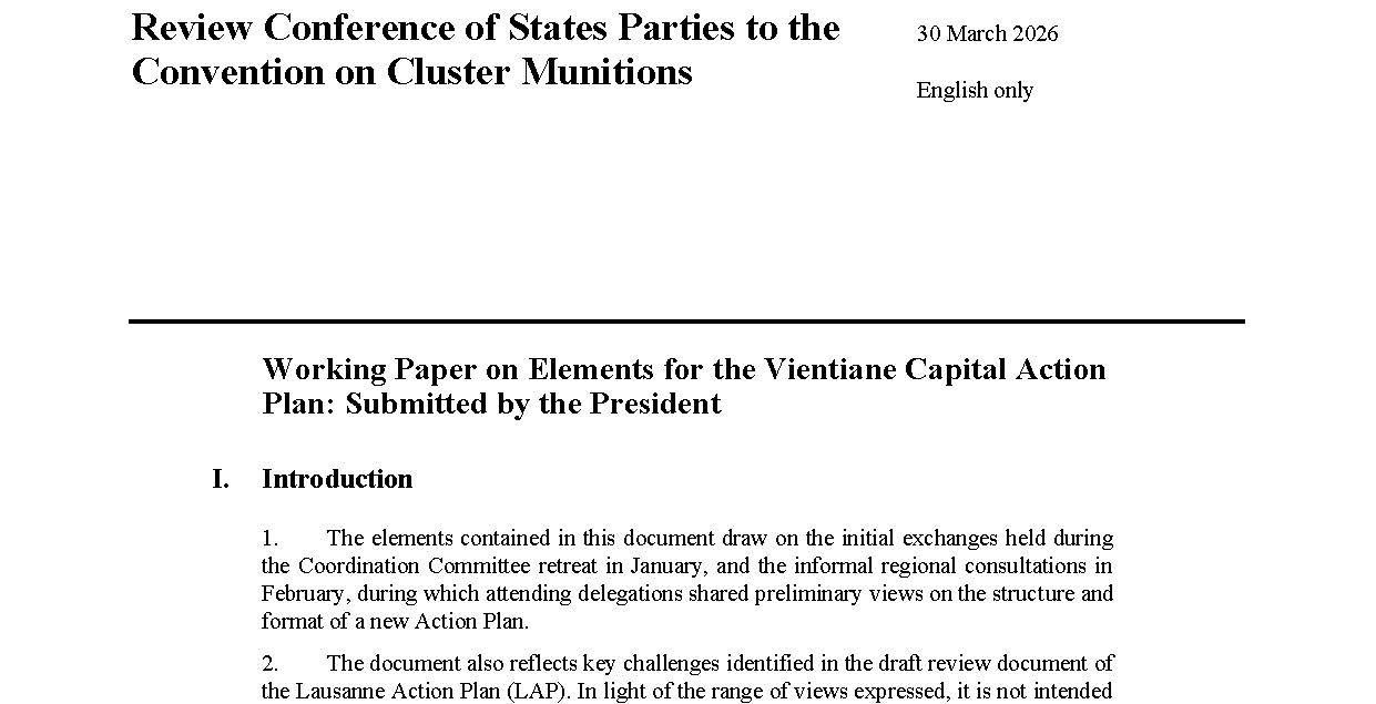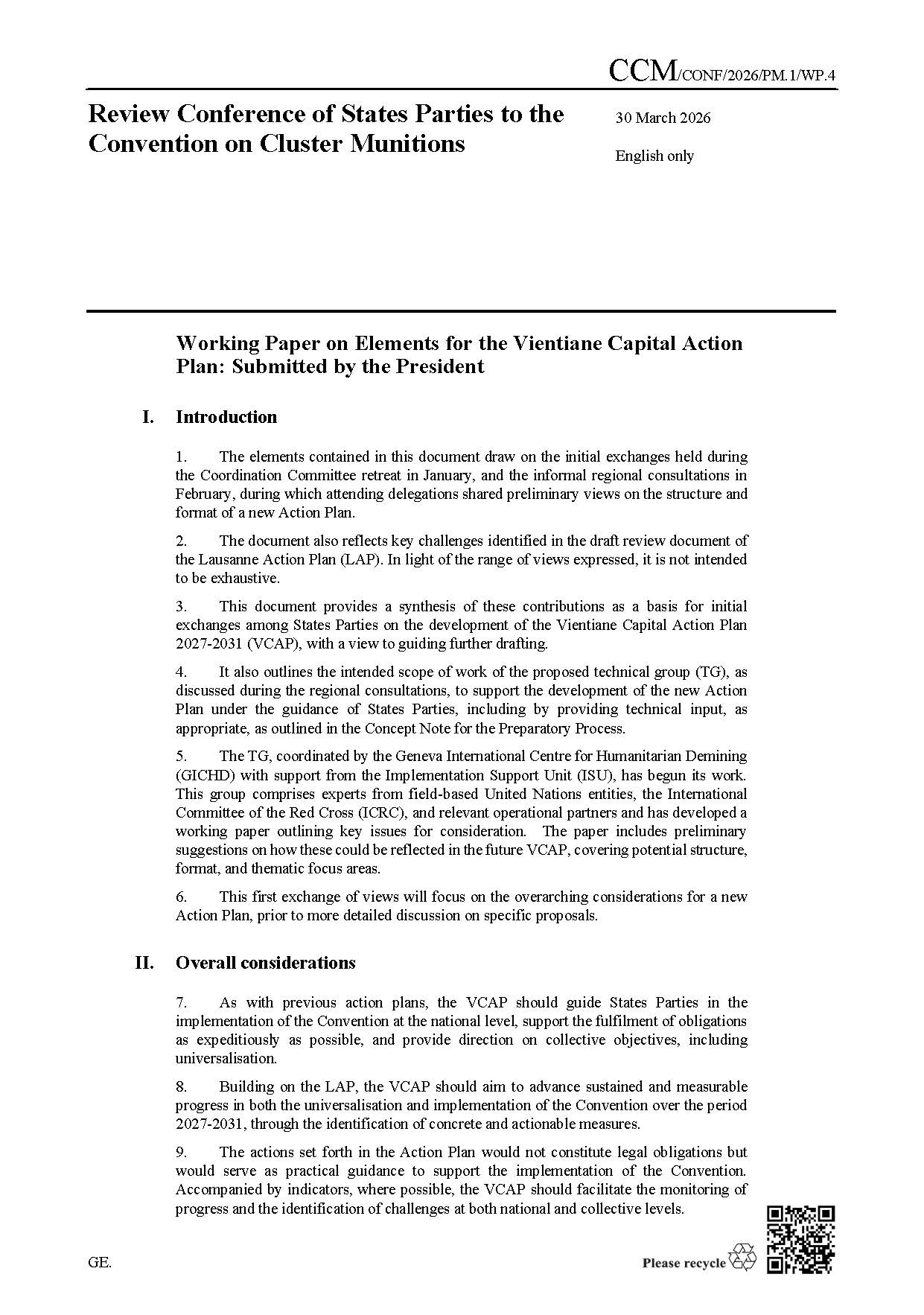 Working Paper 4: Elements for the Vientiane Capital Action Plan 26 March, 2026 Documents See here all the other documents of the Third Review Conference Share: Older Post Working Paper: Reflections and Options on Coordination Committee and the Role of the President (Advance Unformatted) Newer Post Working Paper 3: Reflections and options regarding the Convention’s machinery: Coordination Committee and the Role of the President